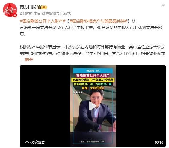 霍启刚此次申报的35项物业均为个人直接持有,未包含家族信托资产,仅这部分公开资产已价值不菲。值得一提的是,公示的多项房产为霍启刚与郭晶晶婚后共同持有,这种毫无保留的财产公示,被外界解读为对婚姻的绝对坦诚,也向公众传递了公职人员的透明态度,完美契合“香港立法会议员须在当选后14天内申报个人利益”的议事规则要求。